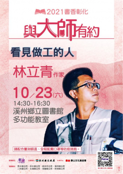 (來源:彰化縣政府) 彰化縣文化局「2021書香彰化-與大師有約」系列講座,場場精彩,由大師帶路,讓書香走入你我生活!10月23日(星期六)下午2:30在溪州鄉立圖書館多功能教室,邀請電視劇「做工的人」原著作家—林立青,以「看見做工的人」為題,分享他如何以多年在建築工地擔任監工的視角,將勞動者的生命故事,透過文學的面貌讓更多人看見,內容精彩,歡迎參加。 ...... [閱讀更多]