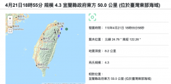 圖說:宜蘭外海發生地震(圖片來源:截自中央氣象局官網) 台灣最近地震不斷,根據中央氣象局觀測, 04月21日下午6點55分,以及04月20日下午3點59分分別於東部宜蘭外海、嘉義縣阿里山鄉發生地震。 04月21日於台灣東部海域發生的地震,震央位於宜蘭縣政府東方50公里處海域,地震深度8.2公里,芮氏規模4.3。各地測得最大震度為宜蘭縣龜山島2級、宜蘭縣宜蘭市、苗栗縣苗...... [閱讀更多]