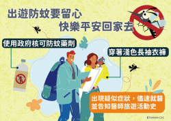 民眾出國旅遊應做好防蚊措施,防範 登革熱 等蟲媒傳染病威脅 -