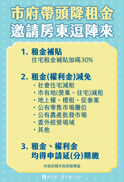 圖片來源:高雄市政府 受疫情影響,高雄市長陳其邁為減輕市民租屋族租金負擔,市府從疫情開始即推出多項租金減免措施。在此,呼籲房東們逗陣來,秉持「同島一命,團結對抗疫情」同理心調降租金,幫助租屋族渡過疫情難關。 一、 住宅租金補貼 原有住宅租金補貼再加碼補貼30%(一次發放)。 二、租金(權利金)減免 (一)社會住宅 社宅店鋪降租50%、社宅住戶降租3...... [閱讀更多]