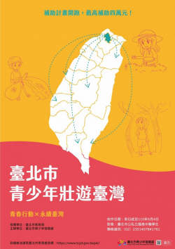圖說:110年度台北市青少年壯遊臺灣補助計畫入選團隊,已經在台北市青少年發展處網站公告(圖片來源:台北市政府) 110年度臺北市青少年壯遊臺灣補助計畫入選團隊,已經在臺北市青少年發展處網站公告囉!本年度有60多組團隊申請,關注多項聯合國永續發展目標(SDGs),包括:健康與福祉、優質教育、減少不平等、永續城鄉和社會、氣候行動、海洋生態、陸域生態等,經評選共選出23組團...... [閱讀更多]