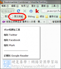 Bookmarklet 是一種書籤形式的小工具,應用範圍非常廣泛,例如按一下轉撲到噗浪、轉推到Twitter、發布到Facebook、訂閱到GoogleReader,甚至還有翻譯、寫信、縮址…等功能。隨著小工具的增加,瀏覽器的功能也更加豐富,但相對的,書籤工具列的空間就越來越少,直到放不下… 這篇文章介紹一款Bookmarklet的合併工具,透過這款工具可以把所有Bookmar...... [閱讀更多]