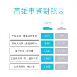 Uber南下了!!繼桃園、台中、新竹之後,Uber第一次在南部展開營業,第一站選在港都高雄,而且還推出一元搭車的活動。剛才用Uber app看了一下重點服務區域的車輛,現在凌晨1點55分叫不到半台,應該是車輛還不多吧,不過以後一定會越來越多人加入uber司機的行列。 Uber的費用也是以里程計算,沒有概念的話可以參考下面這份對照表 優惠活動(轉錄自官方網站) 2/17 (三) 12:...... [閱讀更多]