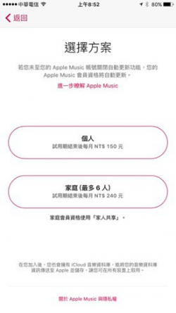 Apple Music 我們等好久了!今天台灣的使用者終於也有 Apple Music 可聽音樂了,除了 KKBOX、Spotify、myMusic 等音樂服務之外再添一項!而且好康的是每個月只要 150 元就可以聽歌聽到飽,前三個月還完全免費,如果有開啟家庭共享功能,只要一人花240元月費就可以讓全家人(最多6人)都能享受 Apple Music 的音樂饗宴,趕快拿起手機平板試用看看 A...... [閱讀更多]