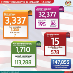 再創新高!【新冠疫情】大馬1月14日:新增3337確診、1710治愈、15死亡,活躍病例32377宗!