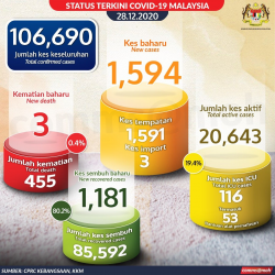 【新冠疫情】大馬12月28日:新增1594確診、1181治愈、3死亡,活躍病例20643宗!