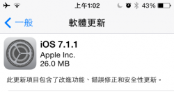 iOS 7.1 版發佈一陣子之後,蘋果在今天(4/23) 推出了 7.1.1 修正版,這個版本主要是「改進功能、錯誤修正和安全性修正」等等,更新檔案容量為 26MB 左右! iOS 7.1.1 主要的功能修正如下: 如何更新:【設定】>【一般】>【軟體更新】即可看到下載!如果有 JB 的使用者,將無法於手機上進行升級(連升級畫面都看不到),JB 使用...... [閱讀更多]