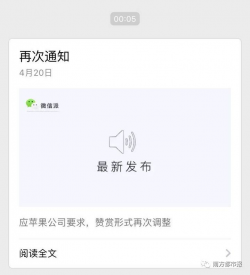 2017年4月20日,早。 # 今日穀雨,春天最後一個節氣 # 頭條 微信凌晨「再次通知」 iOS版連二維碼讚賞也不行瞭 昨日(19日)下午5時許,微信發出「遺憾通知」,稱受蘋果公司新規定影響,2017年4月19日17:00起,iOS版微信公眾平臺讚賞功能將被關閉, 建議通過二維碼轉賬方式對公眾號表示支援。安卓等...... [閱讀更多]