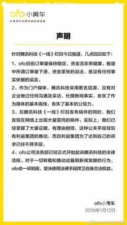 ofo賬戶現金僅能支撐一個月?騰訊科技發聲明稱有準確訂單和數據 12日下午,騰訊科技發表題目為《ofo賬戶現金僅能支撐一個月》的文章,引發.。文章的信源來自一位接近ofo的內部人士。該人士稱,本月ofo發放薪資後,賬目上的現金僅剩下不到6億人民幣。此外,ofo至今仍欠供應商約25億元人民幣,虧...... [閱讀更多]
