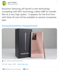 無線傳輸文件更快!傳Samsung Galaxy Note 20將搭載UWP技術,傳輸速度比NFC更快?!