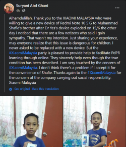 前天就有報道指出,一名男童Shafie因使用贈送的手機上網課時,手機突然著火事件引發大家的關注,而在今天這名男童就收到了小米贈送的新手機! [embedded content] 這名男童的阿姨蘇雅妮在6月15日時透過發文表示,外甥在使用政府贈送學生的手機時著火,而有關帖文也獲得麻坡區國會議員賽沙迪的關注和轉發。 ...... [閱讀更多]