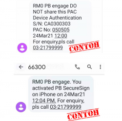 Public Bank提醒用戶,如果收到以下兩種情況的簡訊,得立即聯繫銀行以進行協助! 如果用戶沒有在執行P Be或PB engage任何交易的情況下收到PAC 5 M5(個人驗證碼短訊)以及收到SMS短訊通知表示你的OB SecureSign在不是你擁有的設備上啟動的話,都很有可能是你的線上銀行PBe密碼已經被泄露...... [閱讀更多]