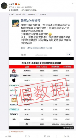 GFK官網闢謠:網傳《2019一月全球手機市場銷量排名》失實,並非官方數據!