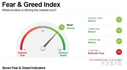 CNN恐懼與貪婪指數周五(8月14日)開盤讀數72,表明市場處在貪婪狀態,較上一交易日下降1; - 自媒體圈