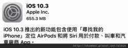 廢話就不多說了 ~~~ 就在不久前 iOS 10.3 開始開放更新 主要更新內容如下 iOS 10.3 推出的新功能包含使用「尋找我的 iPhone」定位 AirPods 和將 Siri 用於付款、叫車和汽車廠商 App。 尋找我的 iPhone • 檢視 AirPods 的目前位置或最後記錄的已知位置 • 在其中一邊或兩邊的 AirPods 上播放聲音來協助...... [閱讀更多]