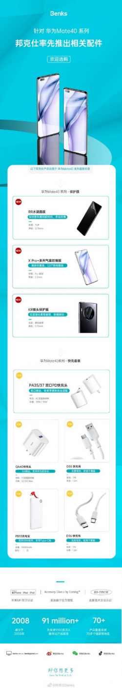 前兩天,余承東發微博稱:「史上最強大的HUAWEI Mate敬請期待! 」,也正式官宣了10月22日晚上8點將會舉辦華為Mate 40系列全球線上發布會!但近日就有配件廠商Benks公開了HUAWEI Mate 40系列的渲染圖,而且還包括了其他配件如充電頭、防爆膜等等。 從曝光的渲染圖來看,所曝光的HUAWEI Mate 40...... [閱讀更多]