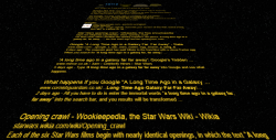 星際大戰(Star Wars)粉絲們,相信都還記得最經典的一句: 「 A long time ago in a galaxy far far away 」 對吧?沒錯!這是在最經典的第一部《星際大戰》電影中,開場白中的第一句話啊! 大家只需要在搜索欄里,鍵入 「 A long time ago in a galaxy far far away 」,頁面就會出現第一...... [閱讀更多]