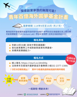 【今傳媒/記者李祖東報導】高雄市政府青年局攜手教育部青年發展署,共同推動「青年百億海外圓夢基金計畫-新創原動力」。本計畫透過海外參訪補助,培育青年創業潛能並拓展國際視野。今年9至10月,將帶領青年赴德國慕尼黑工業大學創業實驗室(TUM Venture Lab)進行為期17天的短期見習。參與青年將接受專業創業指導、資源媒合及新創實務訓練,現正開放報名至5月30日止。 青年...... [閱讀更多]