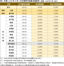 >本期(114年2月)建物買賣移轉棟數及變動率 【今傳媒/記者張淑慧 報導】114年2月,臺南市住宅價格指數為147.82,較1月微幅下降0.08%,但比去年同期上漲4.24%。就住宅型態而言,本期大廈價格指數為154.54,透天住宅價格指數為137.81,與前期相比,大廈價格指數下降0.05%,透天住宅價格指數下降0.15%。觀察各行政區的住宅價格指數,多數區域較前期...... [閱讀更多]