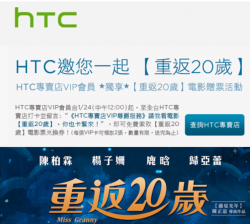 有加入 HTC VIP 會員的朋友應該都有收到這訊息才對,只要您到每個 HTC 專賣店打卡留研究可以免費索取『重返 20歲』電影票兌換卷,每張 VIP 卡可領取 2 張,數量有限送完為止!各位有 HTC VIP 會員的朋友趕快找找你的 E-Mail 信箱看有沒有收到這封信,順便把 HTC VIP 找...... [閱讀更多]