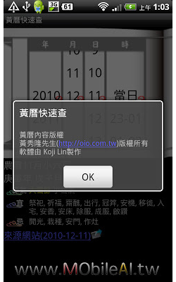 目前這個時代不知道有多少人會常常查詢農民曆的,拜智慧型手機普及,現在只要安裝軟體就可以利用手機來查詢農民曆了,而且只有初次更新之後,就可以離線查詢了喔!是不是很方便呢?有需要的朋友趕快去下載回來玩看看吧! 左圖:操作畫面。右圖:版本說明。 ...... [閱讀更多]