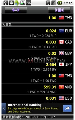 不知道您有沒有注意到每一家銀行服務台的附近幾乎都會掛一個主要匯率換算的資訊看板在附近,以前覺得這東西誰會看呀!只到長大之後出國需要兌換外幣就開始發現這些資訊其實都很實用,雖然現在網路很發達,隨時隨地都可以上網查詢匯率,但是有時候需要換算的時候卻沒有很精準的數字,這時候如果您手邊剛好有一台 Andro...... [閱讀更多]