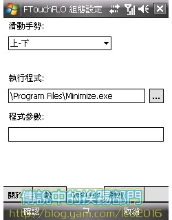 之前介紹過這兩篇文章,可以達到偽阿福機的功能[WM5/WM6]Touch Command+使用技巧+FTouch Flo[WM5/WM6]使用Touch FLO-V1.41 但是在設定方式上還不是很直覺,也就是沒有提供設定介面必須手動編輯文字檔才能夠去更改滑動方向開啟的程式,這幾天XDA的高手又釋出...... [閱讀更多]