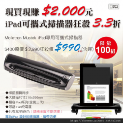 Moletron Mustek iPad專用可攜式掃描器 S400 原網購特價$2,990,現在推出狂殺未稅價,只要$990(含運)限量100組,活動日期4/25-5/8。 安裝專屬APP即插即用,商旅參展文件儲存分享、紙張文件管理備份、美好回憶分享,一台Moletron Mustek iPad專用可攜式掃描...... [閱讀更多]