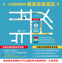 5月報稅季來臨,為便利民眾洽辦房屋稅及申報綜合所得稅,新竹市政府規劃府後街(中央路至中正路96巷間)為臨時機車停車區,管制期間自5月1日至6月30日,每週一至週五上午8時至下午6時,除機車及行人可通行外,其餘車輛皆禁止進入,請民眾留意。此外,新竹市稅務局周邊中正路96巷、中正路、文化街及府後街也有機車停車格,歡迎民眾多加使用。 稅務局表示,房屋稅繳納期間為5月1...... [閱讀更多]