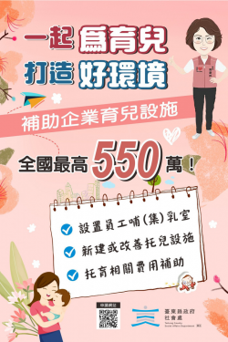 (圖/台東縣府社會處) 為打造性別平等與友善育兒的職場環境,臺東縣政府積極響應勞動政策,落實推動《性別平等工作法》第23條規定,鼓勵企業設置哺(集)乳室與托兒設施,並加碼提供全國最高補助額度550萬元。勞動部訂定「哺集乳室與托兒設施措施設置標準及經費補助辦法」,每年分二期受理申請,第2期自5月1日至6月15日開放申請,鼓勵臺東縣內事業單位踴躍提出申請,攜手打造...... [閱讀更多]