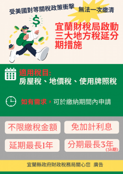 (圖/宜蘭縣府財政稅務局) 為協助受美國對等關稅政策影響的企業與民眾緩解繳稅壓力,宜蘭縣府財政稅務局啟動地方稅減壓措施,即日起受理納稅義務人申請免加計利息延期或分期繳納稅捐。凡宜蘭縣房屋稅、地價稅及使用牌照稅之納稅義務人,自114年4月起受美國對等關稅事件影響,致無法於規定繳納期間內一次繳清稅捐者,得檢具證明文件提出申請,舒緩繳稅壓力。 宜縣財稅局表示,經...... [閱讀更多]