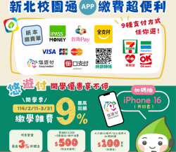 新北市教育局積極推動「新北校園通APP」,提供家長更便捷的線上繳費服務,除了傳統的紙本繳費單外,整合8種線上支付方式,包括iPASS Money、台灣pay、全支付、悠遊付、街口支付、信用卡、QRcode網銀轉帳及超商條碼繳費,最高享有9%回饋,再加碼抽iPhone。 教育局長張明文表示,使用新北校園通APP繳納學雜費,家長們可以不用帶著繳費單奔波超商、銀行,在...... [閱讀更多]