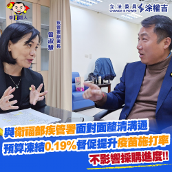 近日,在野黨凍結「充實國家疫苗基金」之預算審議,引發社會各界討論,有心者甚至流傳「刪除疫苗基金,沒有疫苗可以施打」等錯誤訊息。 對此,中國國民黨籍桃園第二選區(大園、觀音、新屋、楊梅)立法委員塗權吉今日特別邀請衛福部疾管署曾淑慧副署長來面對面溝通、澄清謠言!塗權吉表示,由曾副署長親自說明我國目前疫苗採購概況,以及「凍結0.19%」的預算是否會影響到我國整體疫苗採...... [閱讀更多]