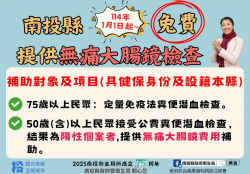 南投縣免費提供無痛大腸鏡檢查。(衛生局提供) 南投縣政府為維護縣民健康,自114年1月1日起推動「南投縣癌症篩檢民眾追蹤管理補助計畫」,補助對象為(一)、75歲(含)以上長者定量免疫法糞便潛血檢查費用、(二)、50歲(含)以上民眾接受公費糞便潛血檢查,結果為陽性個案者,縣府提供無痛大腸鏡費用補助。符合補助對象的民眾,只要持健保卡及身份證至南投縣參與此項計畫的醫...... [閱讀更多]