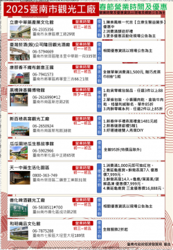 金蛇迎春添喜氣,台南市觀光工廠熱情迎接遊客,春節期間特別營業,提供多樣展示內容及豐富DIY體驗活動,呈現濃厚的節慶氛圍,是闔家出遊的好選擇。為便利民眾春節出遊,經發局盤點各家觀光工廠春節營業時間及優惠活動,邀請大家來台南歡樂迎新春。 2025蛇來運轉,金蛇報喜送吉祥,台南市觀光工廠春節限定優惠搶先看:黑橋牌香腸博物館春節期間不打烊,推出購買小香腸肉乾、盒裝牛肉乾...... [閱讀更多]