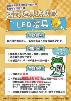 嘉縣補助汰換舊式燈具 符合資格者2/20前申請