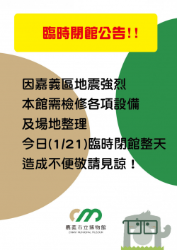 嘉義市立博物館1/21暫停開放1日/嘉義市府提供 嘉義縣大埔鄉今(21)日凌晨0時17分發生規模6.4地震,中央氣象署監測顯示嘉義市達芮氏規模4級。地震測報中心提醒,未來3天可能出現規模5.0以上的餘震,呼籲市民做好防震準備。地震發生後,嘉義市長黃敏惠立即責成各局處展開全面巡檢,嘉義市立博物館因應地震影響,暫停開放一日以進行安全檢修;國民運動中心部分場域也進行...... [閱讀更多]