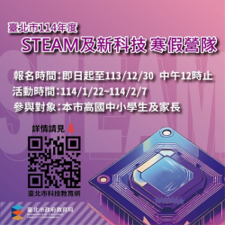 臺北市政府教育局新聞稿 請轉交文教記者 業務聯絡:臺北市政府教育局資訊教育科 卓育欣科長 1999轉1230 新聞聯絡:臺北市政府教育局秘書室 余品瑩督學 0930-936-532 【發稿日期:113年12月23日】 【主題:北市114年寒假STEAM及新科...... [閱讀更多]