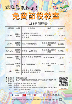 臺北市稅捐處為增進民眾節稅知識,配合各稅開徵、適用優惠稅率申報時程,於每雙月舉辦國稅或地方稅的免費租稅課程,除傳達最新稅務資訊外,並提供諮詢管道。 稅捐處表示,「房屋稅差別稅率2.0」已於113年7月1日正式上路,今年5月開徵房屋稅將首度適用,因新制增訂住家用房屋必須辦竣戶籍登記為自住要件、出租且申報租賃所得達租金標準的住家用房屋可適用較低稅率,均須於114年3月24日前完成設立戶...... [閱讀更多]