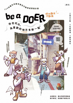 由臺北市都市更新處辦理的「臺北市都市再生行動育成實驗」(以下簡稱be a DOER)徵件開跑!即日起至114年3月28日止,歡迎具備「為公共、有都市、在地方」的行動提案,報名參加! 也許你曾經在社區中看到一個無人使用的空間,構想這個空間可被再利用的無限潛力;也許你關注地方文史的傳承,期待讓更多人與你共享地方感;也許你剛移居到臺北,關注居住議題,希望打造出互助的社群,讓移居這件事可以...... [閱讀更多]