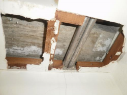 本案例座落於台北市南京東路五段某公寓屋齡約20年,地上12層地下1樓屋主居住於11樓屋主口述漏水情形公共空間走道下雨過後有滲漏水潮溼現象,而且從天花板慢慢延伸至牆壁。 漏水原因推測公共空間走道天花板、牆壁經現場初步勘查,研判漏水之主因可能係因樓上給排水系統有破損(005)、鬆脫加上管道間及樓板有裂縫致使水份滲入,於壁體內積存,而造成樓板內部含水量增加,這些水份進而分解水泥內之...... [閱讀更多]