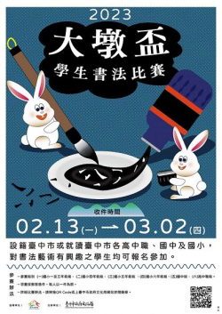 記者李喬智/臺中報導 新的一年,前兔似錦!大墩盃學生書法比賽將於2月13日開放收件,凡就讀或設籍臺中市的高中、國中及國小學生皆可報名參賽,比賽組別共分6組,獲獎學生及參賽成績優異之學校及教師,就有機會得到獎狀及禮券獎勵,歡迎各級學校學生踴躍參賽。臺中市政府文化局表示,今年高中職組學生將挑戰書寫對開尺寸,放寬尺幅規定後學生能更自由選擇書體,可望能欣賞到更多精彩作品。 文化局強調書...... [閱讀更多]