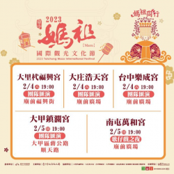 記者李喬智/臺中報導 宮廟風華鬧元宵!臺中市政府文化局主辦「2023臺中媽祖國際觀光文化節」系列活動,將於2月4日(六)元宵節前夕在台中樂成宮、大庄浩天宮及大里杙福興宮,2月5日(日)元宵節當天在大甲鎮瀾宮及南屯萬和宮,由全國優質表演團隊及當紅藝人接力登臺演出,歡迎民眾踴躍前往欣賞,一同歡慶元宵佳節! 文化局表示,臺中媽祖國際觀光文化節自縣市合併後迄今已辦理逾13年,活動場域遍...... [閱讀更多]