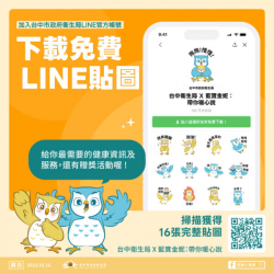 中市衛生局推藍寶金妮16張免費LINE貼圖 【News586/特派員孫崇文報導】 台中市政府衛生局今(28)日推出「台中衛生局×藍寶金妮:帶你暖心說」免費LINE貼圖,即日起只要加入「台中市政府衛生局」LINE@官方帳號好友,就可立即下載,給您16張超可愛貼圖,貼心用語可用來關心親友,代表暖暖的心意。 衛生局長曾梓展表示,父母的主動關心與正向支持鼓勵對青少年心理健康影響最大,但...... [閱讀更多]