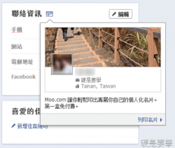 Facebook 把個人頁面改成動態時報的樣式後,使用者可以在頁面上擺放喜歡的封面圖片,別人也可以透過封面圖片的設計來瞭解你,但封面圖片的效果可不是只有自己才能看到,不久之前 Facebook 偷偷改了一個小地方,當你把滑鼠停留在朋友的 ID 上幾秒鐘就會出現他的封面圖片和簡介,很特別也很別緻,不過你可能不知道,前陣子流行的 Facebook 名片已經悄悄的結合到 Facebo...... [閱讀更多]