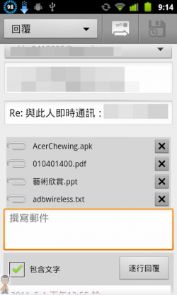 這邊用的檔案總管程式是文件管理器的ASTRO,如果你用其他的檔案總管程式可能就不能這樣做了。在想要回覆的信件中按下Menu,選擇附加。選擇「ASTRO」。第一個是apk格式,也就是在Android中的安裝檔案格式,你如果是點一下,就會發現......出現要你瀏覽還是安裝,這樣根本不能夾帶,但如果你長按的話:就可以夾帶檔案了。其他大多都只需要點一下就可以夾帶了。... [閱讀更多]