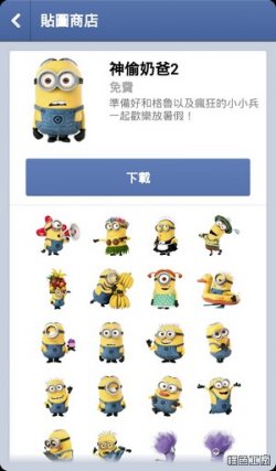LINE 的貼圖總是讓大家很瘋狂,而 Facebook 也有專屬的貼圖商店,讓手機即時通更加有趣味性!而現在神偷奶爸 2 的表情貼圖也上架囉!而且是免下載使用! 首先也請大家安裝 Facebook 的手機即時通,這樣透過 Facebook 聊天也會更方便,也才會有貼圖功能唷! iOS: https://itunes.apple.com/tw/app/facebook-sho...... [閱讀更多]