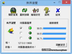 增強了突破封鎖的能力,解決了近期網路封鎖加劇的問題。集成了應急模式。應急模式特點是找到服務器後會打開https連接的主頁,所以功能和速度上會差一些,但是突破封鎖能力會更強。。為瞭解決中共控制的防病毒軟體的潛在問題,推出多個替換版。功能上完全等同。 其實這軟體的功能與 無界瀏覽差不多,主要都是透過80 port先連到某一個未知的地方,這條連線就會成為一條通道,之後只要在瀏覽器、...... [閱讀更多]
