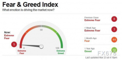 CNN恐懼與貪婪指數周一(3月23日)讀數5,表明市場處在極度恐懼狀態,較上一交易日下跌3點; - 自媒體圈