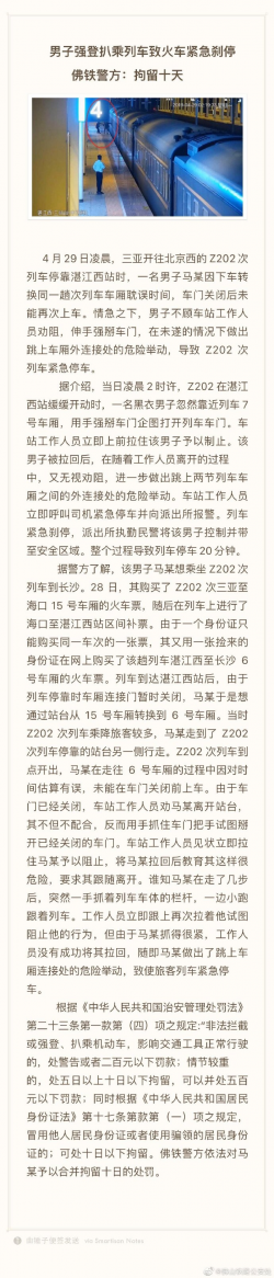 新京報快訊 據廣州鐵路公安局佛山鐵路公安處官方微博消息,4月29日凌晨,三亞開往北京西的Z202次列車停靠湛江西站時,一名男子馬某因下車轉換同一趟次列車車廂耽誤時間,車門關閉后未能再次上車。情急之下,男子不顧車站工作人員勸阻,伸手強掰車門,在未遂的情況下做出跳上車廂外連接處的危險舉動,導致Z202次列車緊急停車。警方依法對該男子予以拘留十日的處罰。 通報全文如下: ...... [閱讀更多]